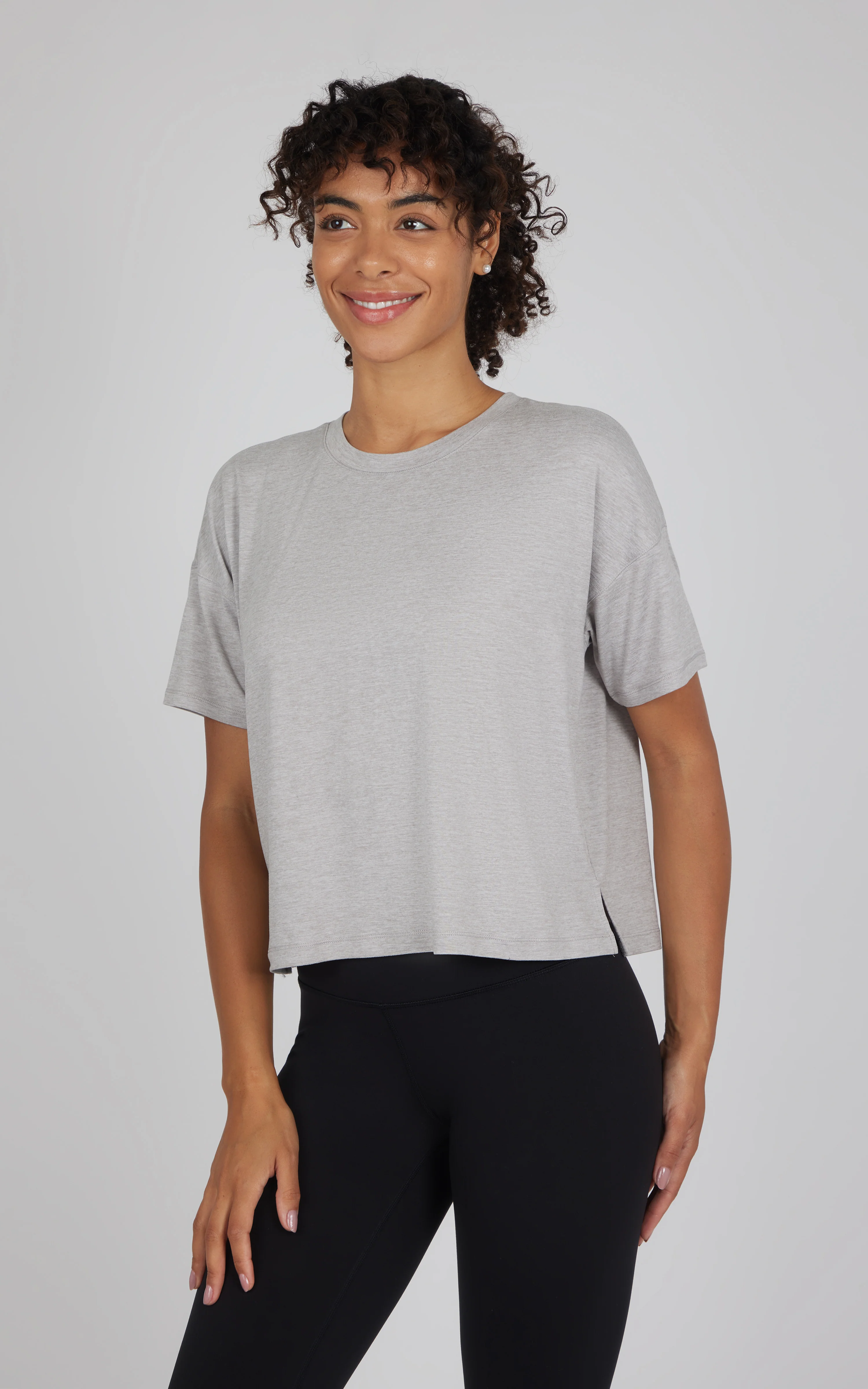 Our super soft boxy tee will go with all your workout wear or look great going out of the house or under a cardigan or jacket. This top is also ideal for physical activities, from yoga to pilates, biking, and running.