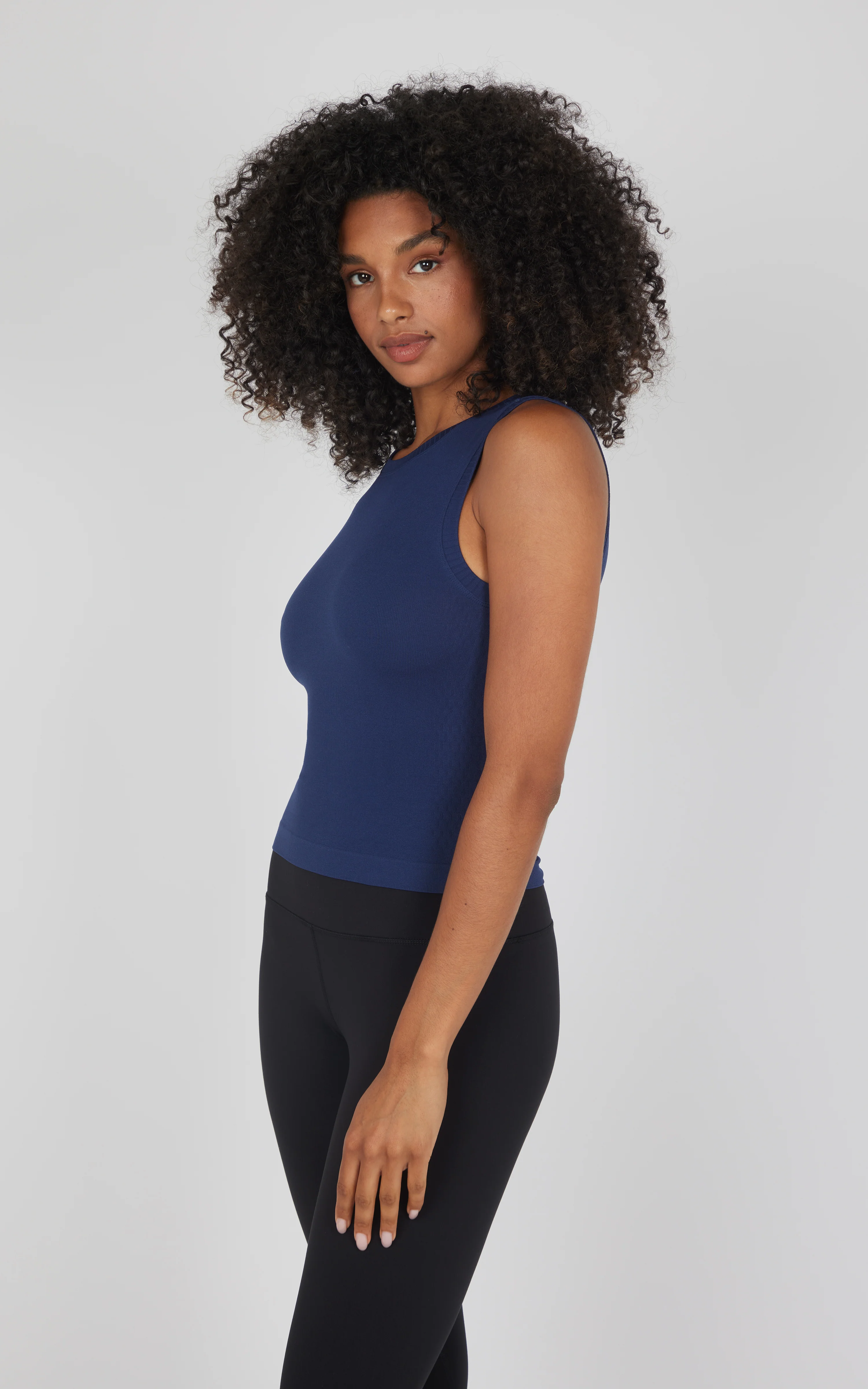 Effortlessly move and stretch in our Seamless Aeroflex High Neck Tank. Featuring side and back mesh panels, this tank provides breathable comfort while the seamless construction and high neck design offer a supportive and flattering fit. Perfect for any workout or athleisure look.